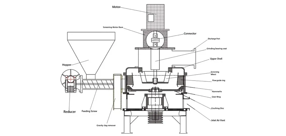 El flujo de procesamiento específico es simple: primero, se introduce la materia prima en polvo grueso con un tamaño de partícula de no más de 10 mm en la tolva de alimentación y luego se transporta a la cámara de trituración a una velocidad constante a través de un alimentador de frecuencia variable; El disco de molienda en la cámara de molienda gira a alta velocidad, impulsando el martillo y el rodillo de molienda para que funcionen sincrónicamente a alta velocidad, generando una fuerte fuerza centrífuga y arrojando la materia prima en polvo grueso a la pared interior de la cámara de molienda; Bajo la acción de la fuerza centrífuga, las materias primas sufren graves colisiones, cizallamiento y fricción con placas de revestimiento resistentes al desgaste, martillos trituradores y rodillos trituradores, completando la trituración preliminar; Después de la trituración inicial, el material será llevado a la cámara de clasificación mediante el flujo de aire de presión negativa generado por el ventilador de tiro inducido. La rueda de clasificación en la cámara de clasificación gira a alta velocidad para clasificar con precisión según el tamaño de las partículas. El polvo ultrafino que cumple con los requisitos (el tamaño de las partículas se puede ajustar según sea necesario) será llevado al colector por el flujo de aire para completar la recolección; El polvo grueso que no cumple con los requisitos de tamaño de partícula será interceptado por la rueda niveladora y enviado de regreso a la cámara de trituración para una trituración secundaria hasta que alcance el estándar de tamaño de partícula especificado, asegurando la uniformidad del polvo terminado.