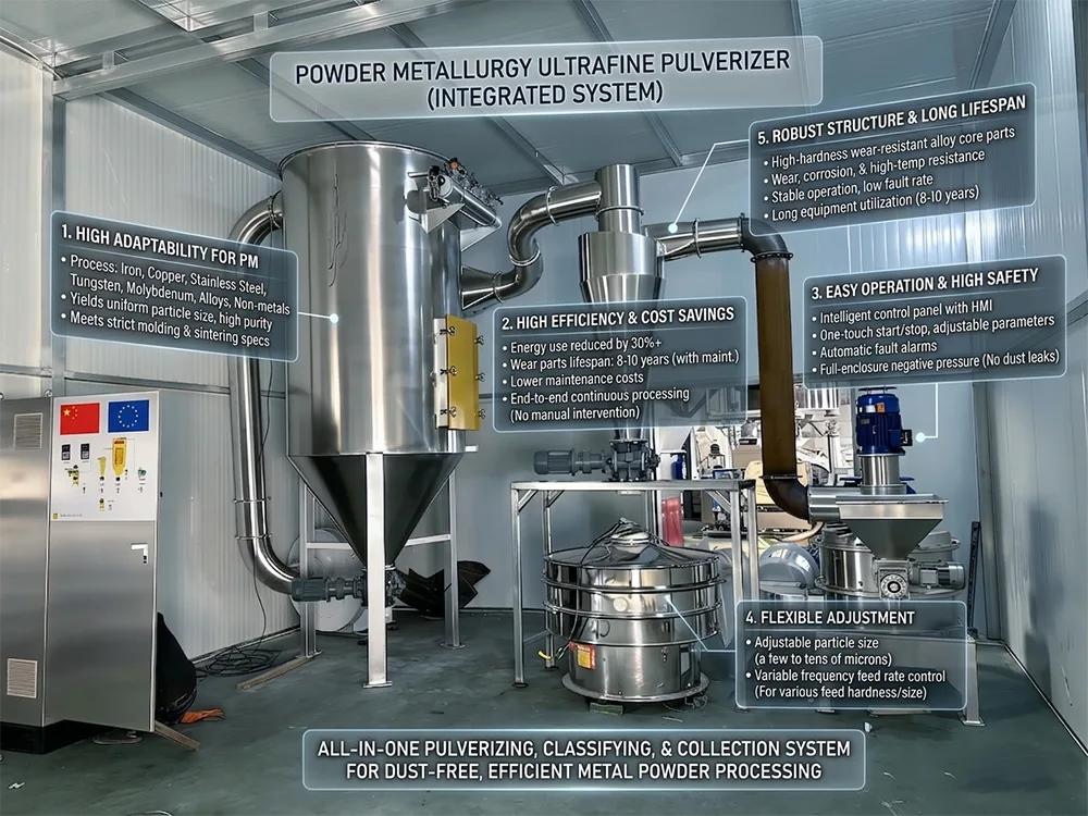 El pulverizador ultrafino para pulvimetalurgia es un equipo especializado desarrollado específicamente para la industria de pulvimetalurgia. Se utiliza principalmente para el procesamiento ultrafino de polvos metálicos, polvos de aleaciones y diversas materias primas en polvo no metálicas, y puede adaptarse perfectamente a los requisitos de procesamiento de materias primas de todo el proceso de producción de pulvimetalurgia. En comparación con los equipos de trituración ordinarios, la característica más destacada del pulverizador ultrafino para pulvimetalurgia es su cumplimiento de los estrictos estándares de la industria de pulvimetalurgia, que puede controlar con precisión el tamaño de las partículas del polvo, garantizar una distribución uniforme de las partículas y evitar por completo la contaminación secundaria, asegurando la alta pureza del polvo terminado y cumpliendo plenamente con los requisitos básicos del posterior conformado, sinterización y otros procesos.