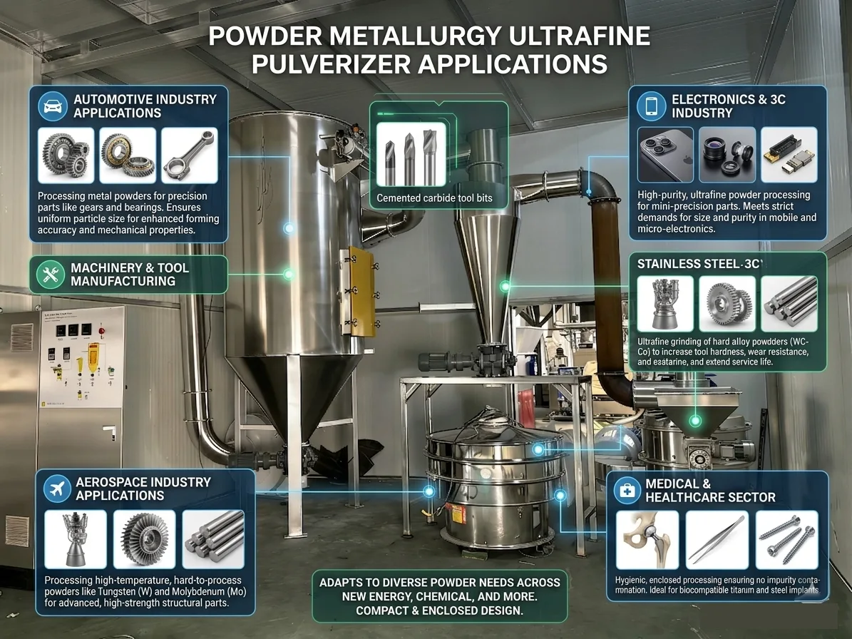 El pulverizador ultrafino para pulvimetalurgia se utiliza principalmente para el procesamiento ultrafino de materias primas en toda la industria de pulvimetalurgia y puede adaptarse al tratamiento de trituración de diversos polvos metálicos, aleaciones y no metálicos. Se utiliza ampliamente en múltiples campos, como el de automoción, maquinaria, electrónica, aeroespacial, médico y fabricación de herramientas. Los escenarios de aplicación específicos son los siguientes: